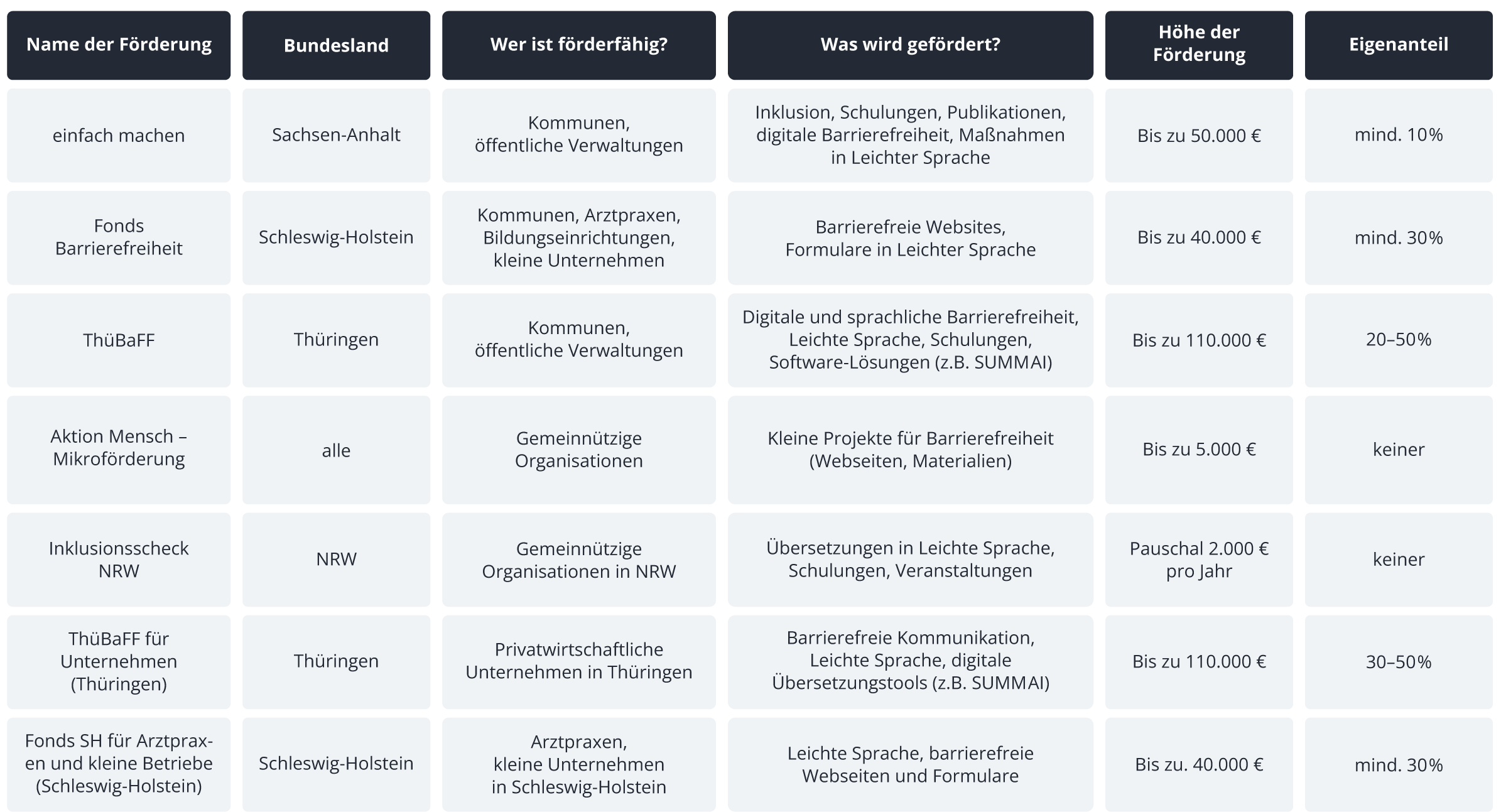Schleswig-Holstein fördert Maßnahmen zur barrierefreien Kommunikation. Besonders relevant: Kommunale Websites oder Formulare, die in Leichte Sprache übertragen werden. Arztpraxen, Kommunen oder Bildungseinrichtungen können bis zu 70 Prozent Förderung erhalten (Webprojekte z. B. mit bis zu 40.000 Euro). Die Antragstellung erfolgt über das Sozialministerium.
